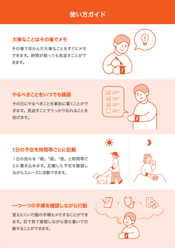 ・常に身に着けておくことで、大事な事をその場でメモすることができ、いつでも内容を確認できるので物忘れの不安を軽減できます
