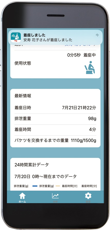 スマホ、タブレットで日々の排泄記録と排泄状態を受け取れるポータブルトイレ