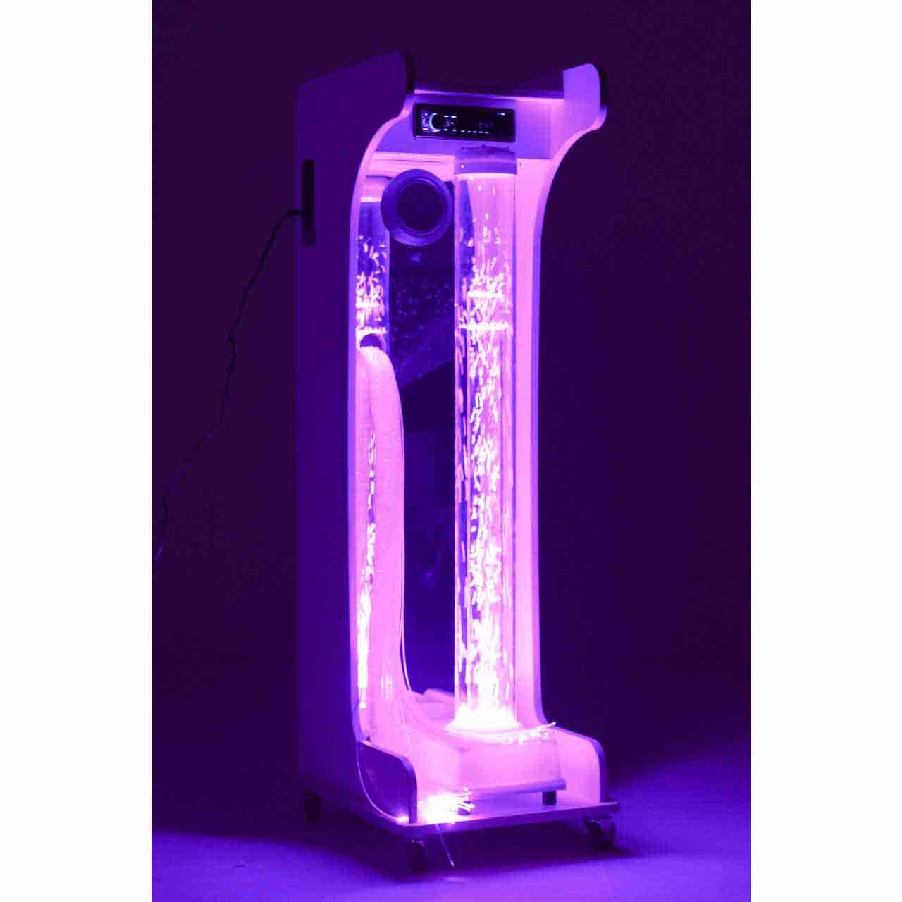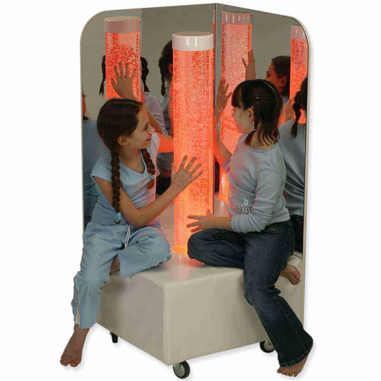 バブル・ユニットの後ろには三面鏡。収納スペースには下記スヌーズレングッズがぎっしり。キャビネットにはキャスターも付いていて、移動も簡単です。専用の部屋がなくても居室や施設等持ち運ぶ先々でスヌーズレンができます。予算に応じて中身を変更できます。