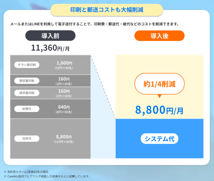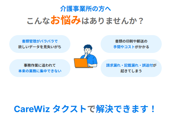 CareWizタクストは、AI活用して請求書作成・印刷・封入・郵送・署名回収の費用と時間を削減&効率化できる介護事業者向け電子書類管理サービスです。