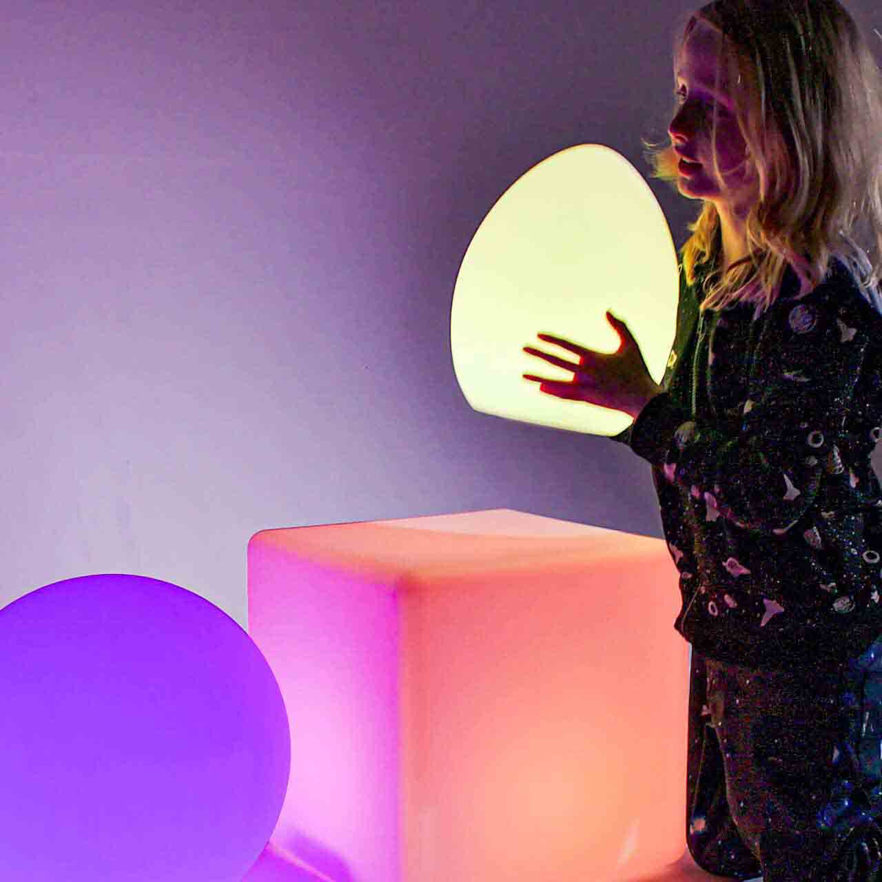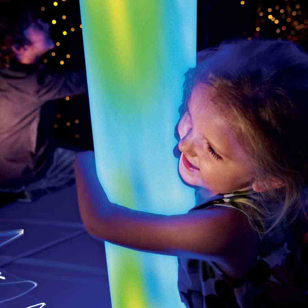 天井や壁をカラフルに照らすランプや、抱いたり座れるカラー・ライティング、ぐるぐる回転するライトなど、視覚等を刺激するライティング・グッズを多数取り揃えています。スターライト・クラウドは、たくさんの小さな電球が点灯するボードが柔らかな白布が覆われており、まるで夜空に瞬く星の輝きが柔らかな雲に覆われているようです。