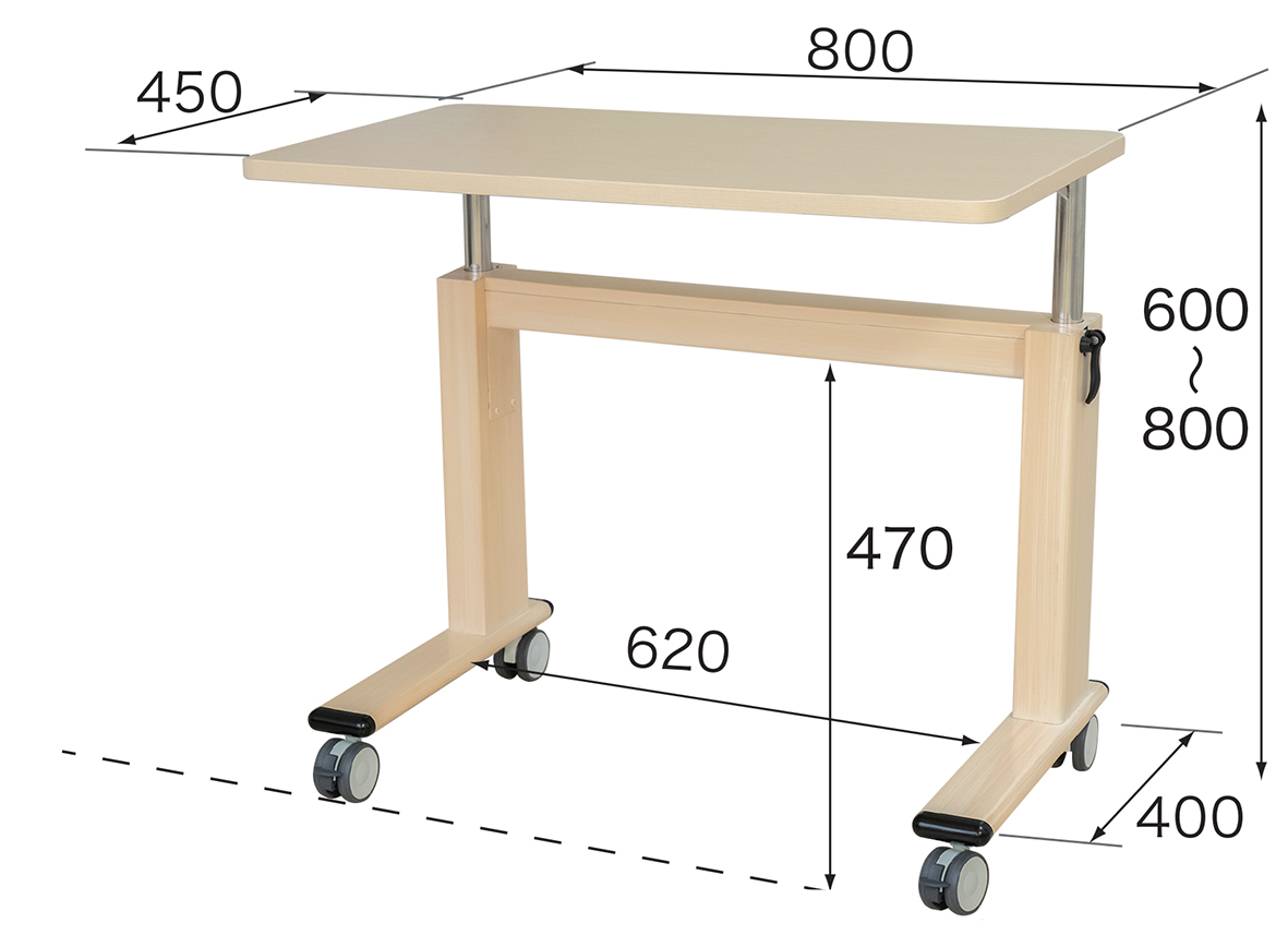 病院、福祉施設、障害者支援施設で選ばれている、しっかりとした作りと簡単な操作、上下昇降幅が大きい1人用のテーブルです。足元空間は広いのに、テーブルのガタつきや天板のタワミもありません。上下昇降、固定の操作もスピィーディーに行えます。