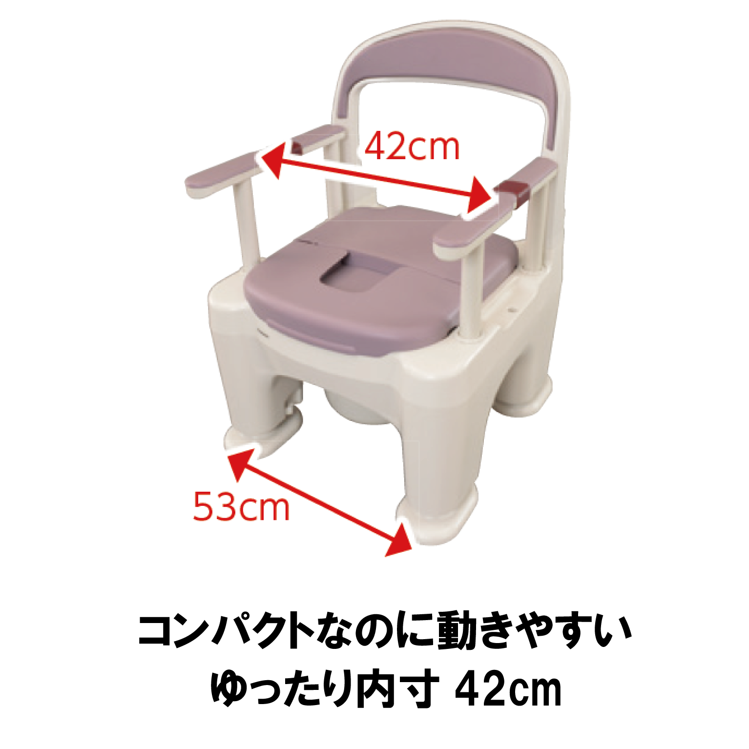 (例:プラスチック便座) 【サイズ】製品寸法:幅53×奥行57×高さ75~87cm(1cmピッチ13段階)、便座面高さ:35~47cm【重量】9.5kg 【材質】本体・便フタ・ひじ掛けカバー・ポット・防汚トレイ:ポリプロピレン、ひじ掛け本体・背もたれ本体:ABS樹脂、背もたれカバー:ポリエチレン、キャスターPOM樹脂