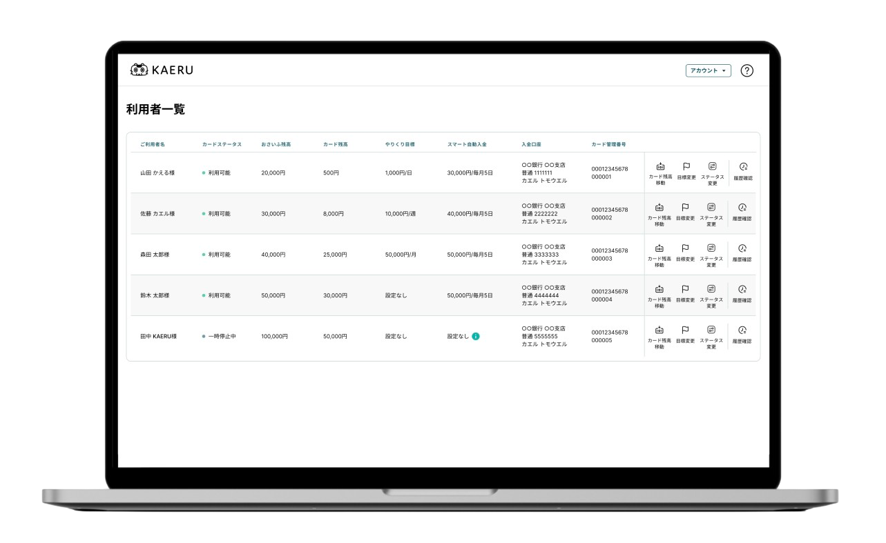 ・履歴閲覧、予算設定変更、カード停止/再開等の操作を行える