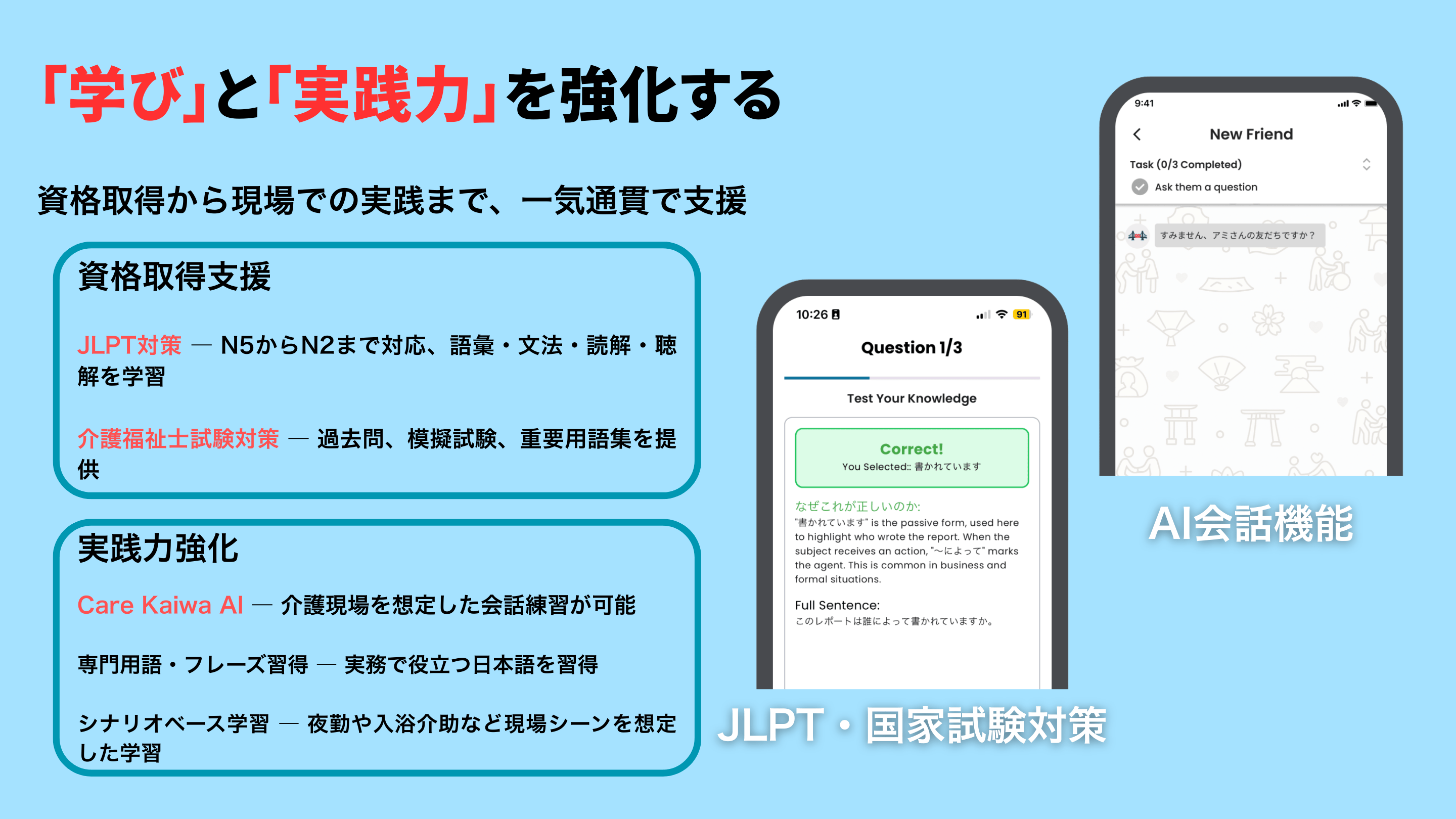 KizunaCareは、外国人介護人材のJLPTや介護福祉士試験の学習を支援し、実践力の強化としてAIとの対話を通じて現場で役立つ介護用語やフレーズを習得できます。さらに学習計画や進捗可視化を提供し、継続学習を支援します。