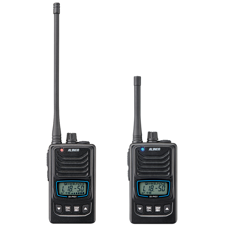 ●DJ-P422B-TはDJ-P421Aの機能に加えて4台までの中継器を結んで通話エリアを大きく広げる無線連結中継通話に対応。面倒な設定変更が容易にできるエアクローン、ハードな現場からご要望の多い着信バイブレーターも実装しました。アンテナも通話距離最優先のロングと、取り回しの良いミドルをご用意しています。