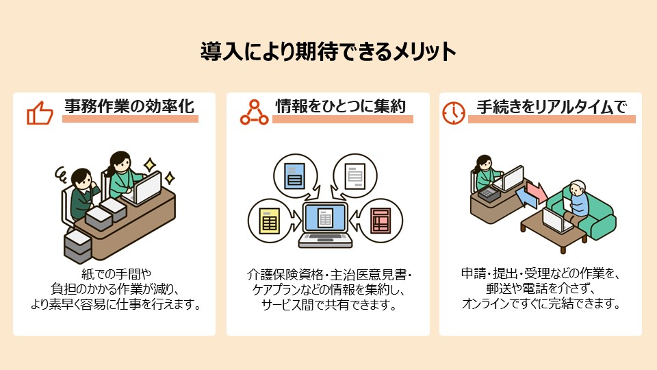 介護情報基盤は、介護に関する情報やサービス内容を集約し、利用者・事業所・医療機関・市町村といった介護に関わる方々の連携を強める仕組みです。現場負担を減らし、より働きやすい環境を実現するほか、ケアの質を高め、人と向き合う時間を増やします。