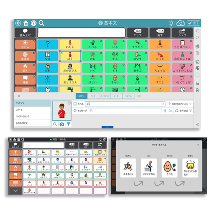 言葉の発声、発話、学習、理解、使用に困難のある人々のためのコミュニケーション支援ソフトウエアです。自閉スペクトラム症(ASD)、レット症候群、知的障害のある方や、ALS、神経難病、脳血管疾患、あるいは失語症のある方など、ことばの発達、回復、サポートを必要としている全ての人々に適しているソフトウェアです。自動版と大人版がございます。