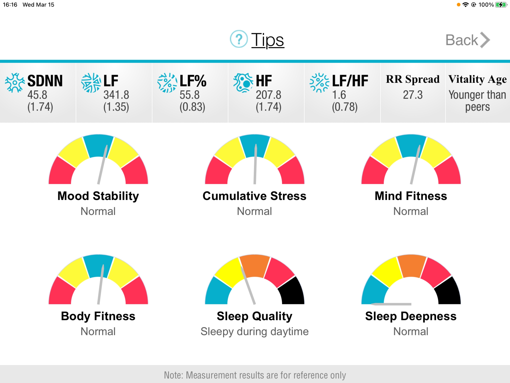 Our HRV Analyzer offers 6 Indexes: Mood Stability/Cumulative Stress/Mind Fitness/Body Fitness/Sleep Quality/Sleep Deepness.