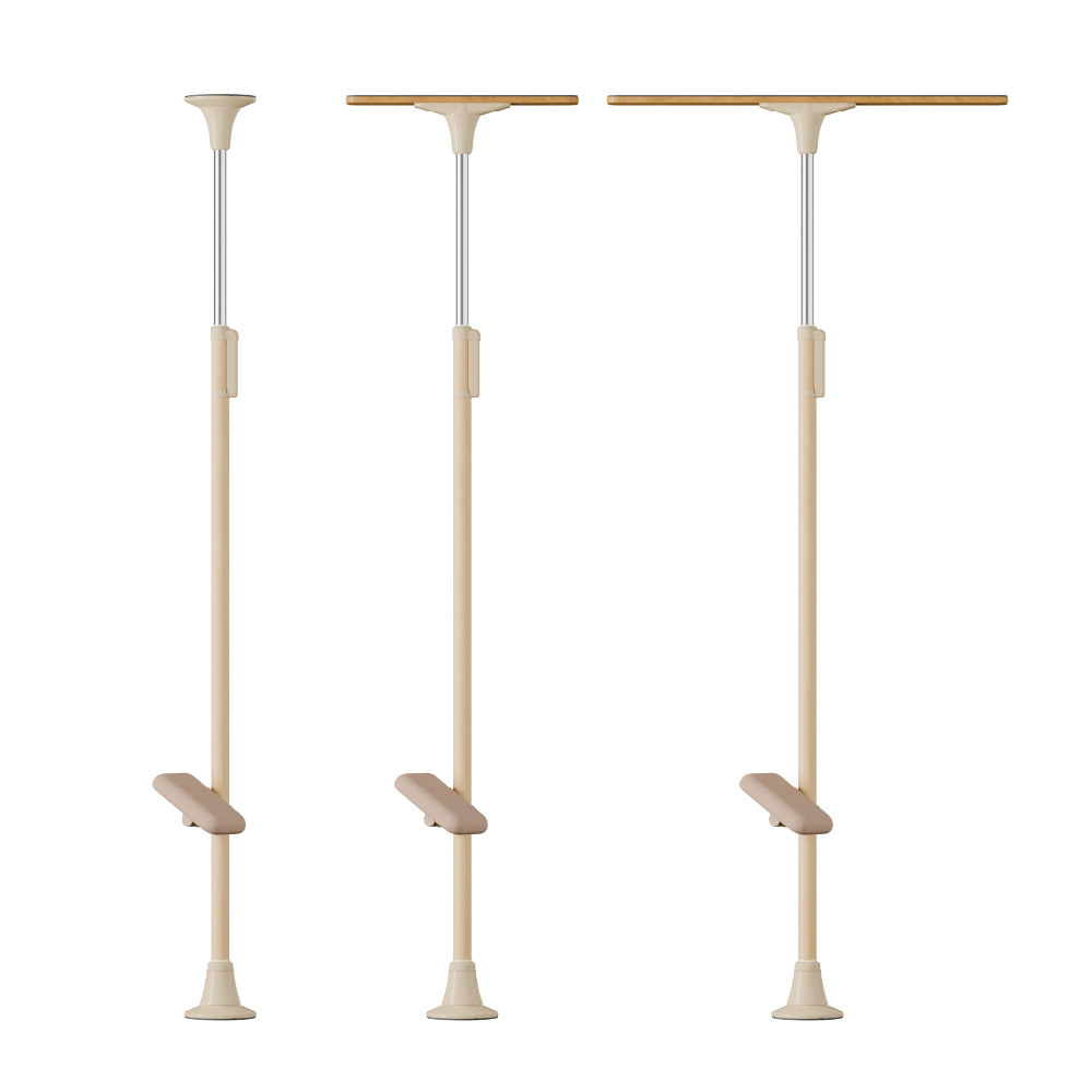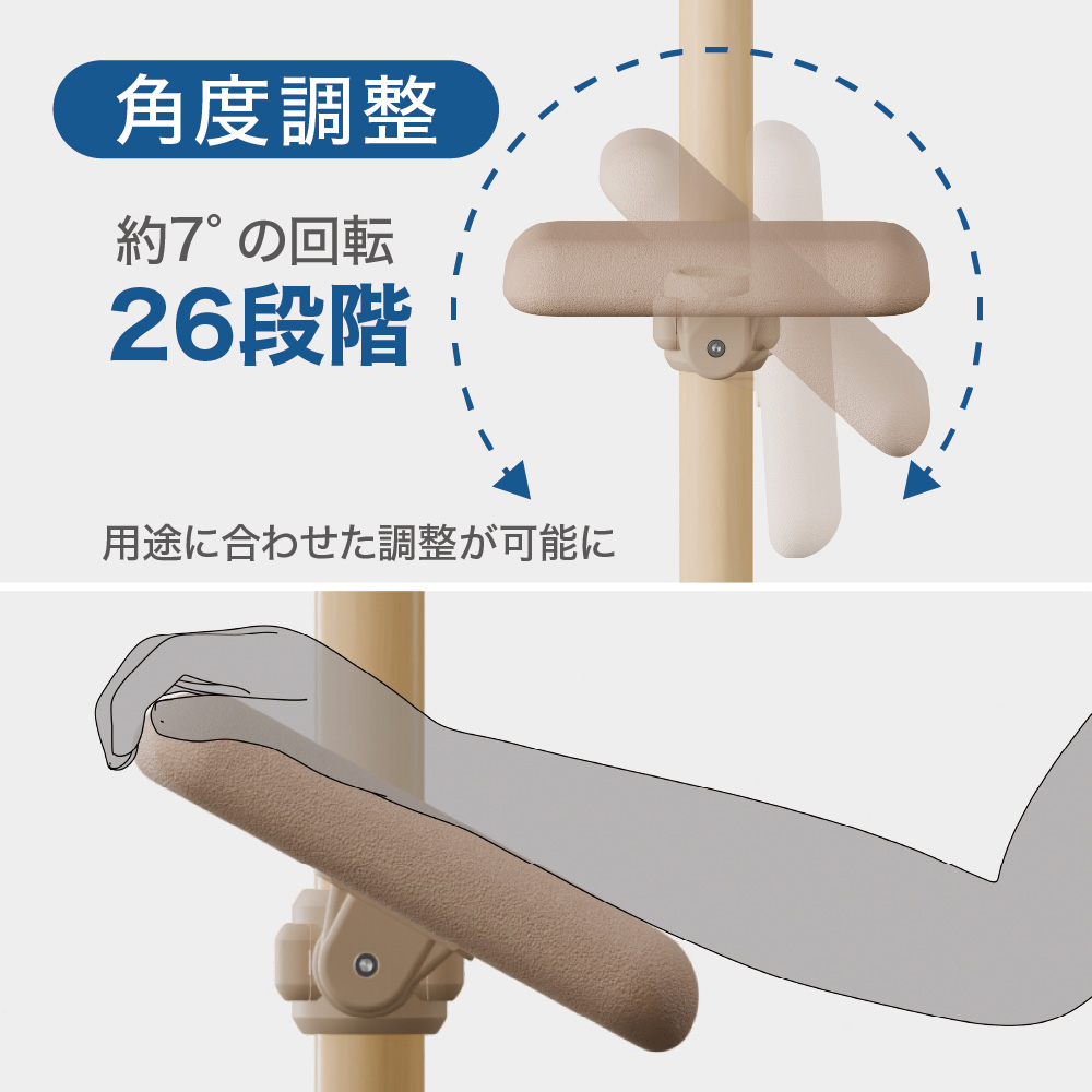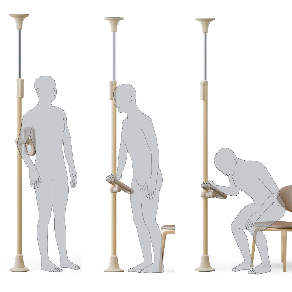 垂直設置では立位や座位での体幹の側方支持ができ、着衣・脱衣の際には両手が空くため、介護者・要介護者双方の負担を軽減します。傾斜に沿って上腕部を預けることで前傾姿勢がとりやすく、立ち上がりの重心移動を無理なく誘導します。水平にしてプッシュアップで活用でき、握力が不安な方にも対応し、エラストマー素材による快適な使用感を実現しています。