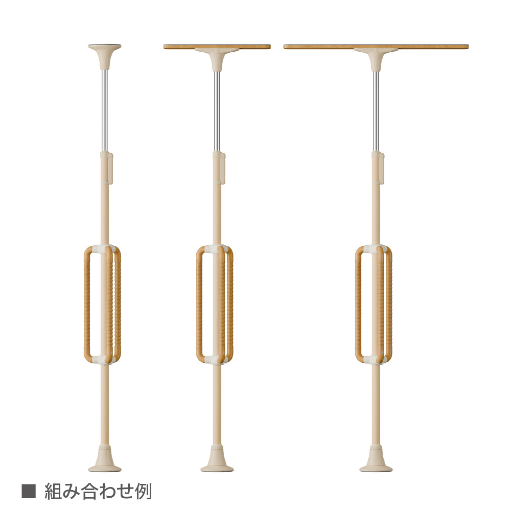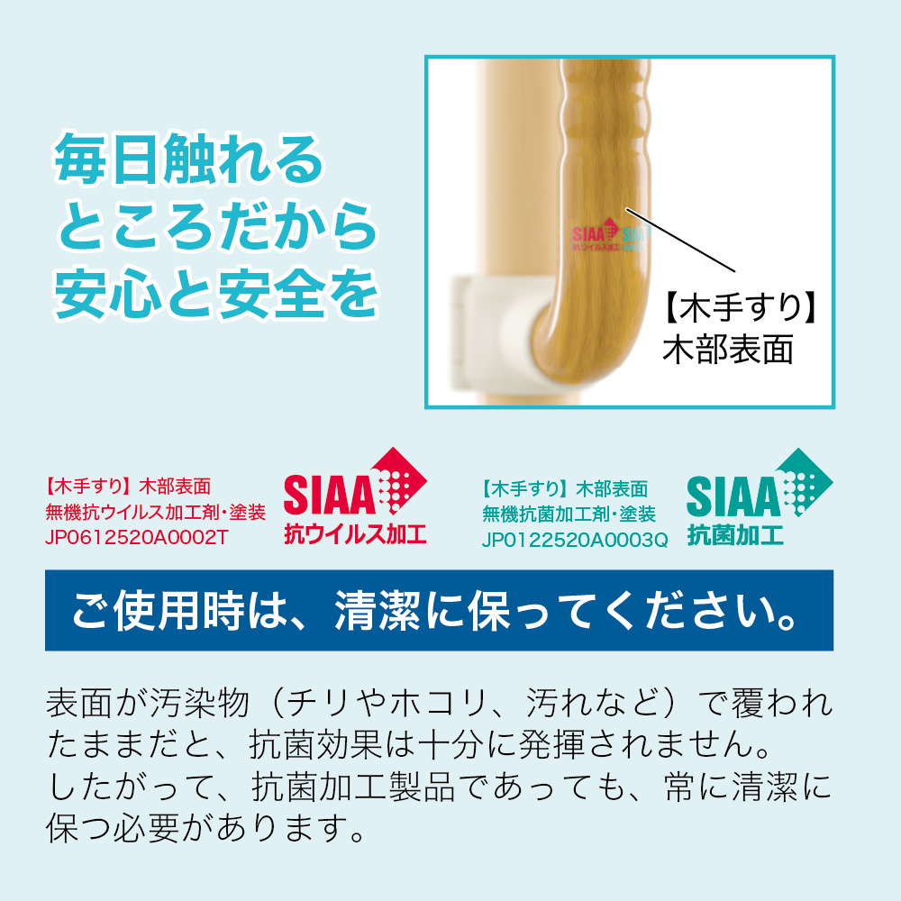 常に2点支持を確保しながら、次の動作へスムーズに移行できる構造です。パーキンソン症候群などのリハビリにも有効で、手足の連動を促進します。木製手すり部には抗菌・抗ウイルス加工を施しており、施設での使用にも安心です。