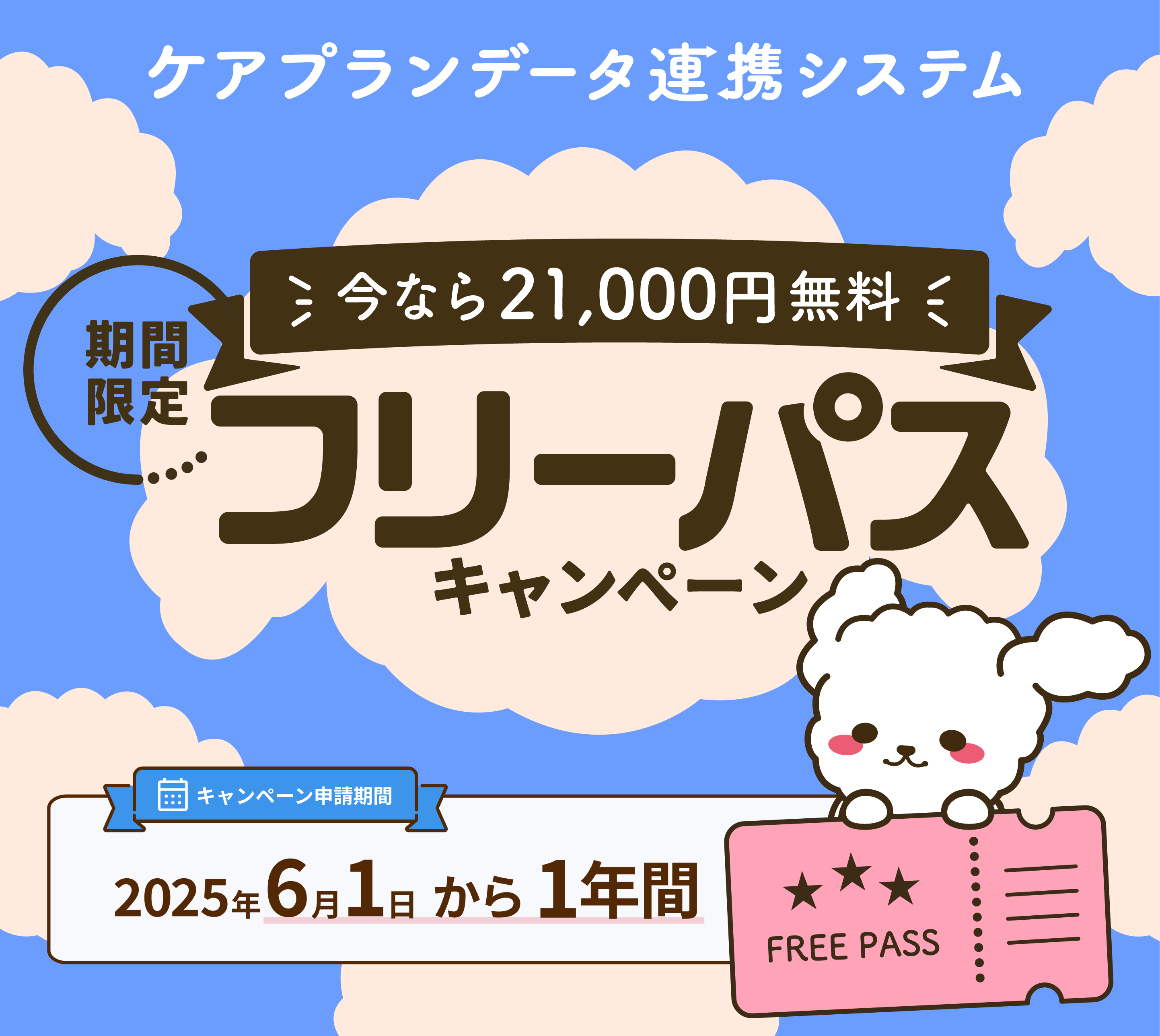 「フリーパスキャンペーン」とは、通常21,000円/年かかるライセンス料が1年間無料でご利用できる期間限定のキャンペーンです。「導入コストが気になる」「周りの事業所を誘いたいけれど、きっかけがない」。そのようなお声にお応えし、業務改善の第一歩を、ライセンス料のご負担なく始められるキャンペーンとなっています。