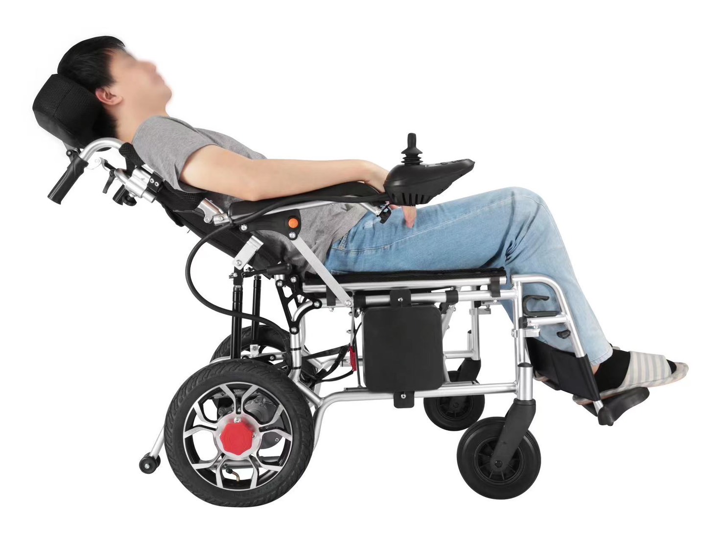 左右にある手動の油圧レバーでリクライニングでき、姿勢を変えリラックスサボンできる電動車椅子