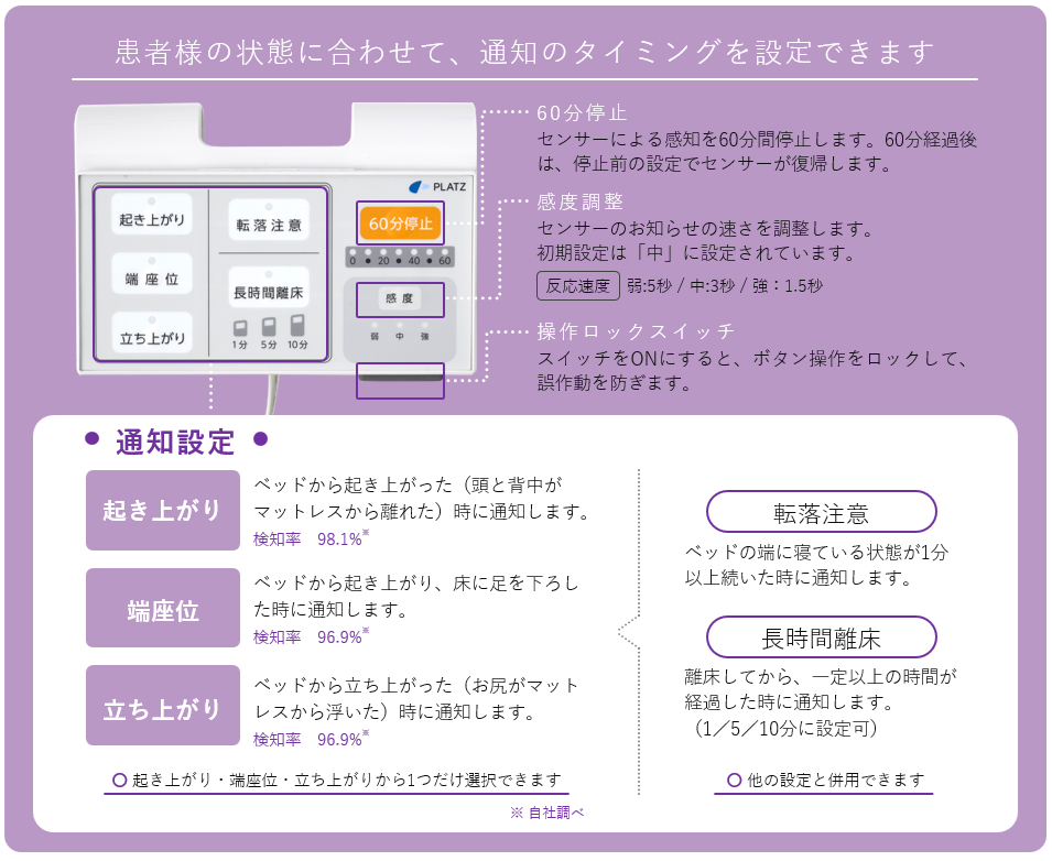 ご利用者の体重などの設定も不要で、通知に必要な状態をスイッチで選択するだけの簡単操作です。