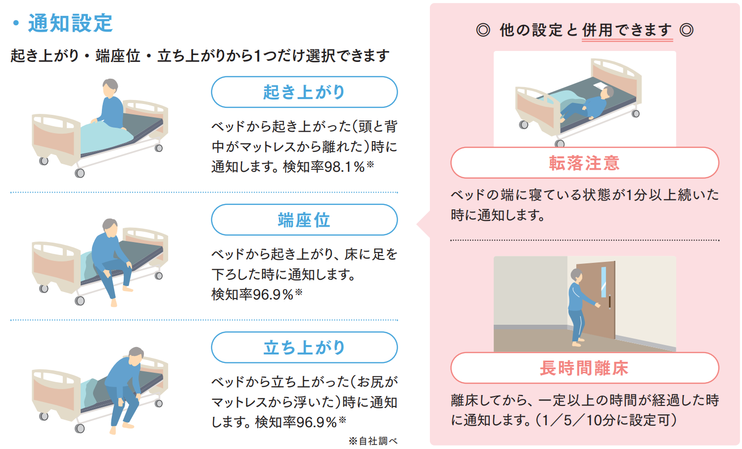 ・患者様の状態に合わせて通知したい状態を設定できます 【起き上がり】 【端座位】 【立ち上がり】 【転落注意】 【長時間離床】