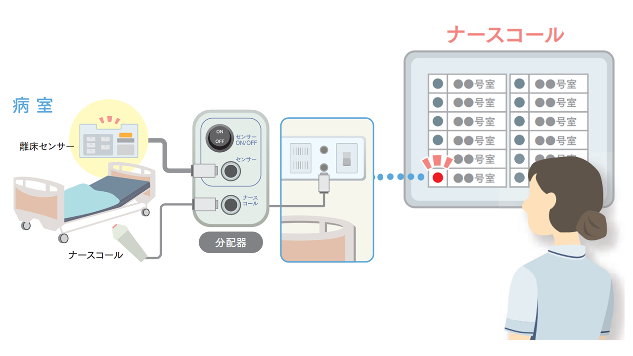 患者様の起き上がりや離床などの状態を検知し、ナースコールに直接お知らせします。