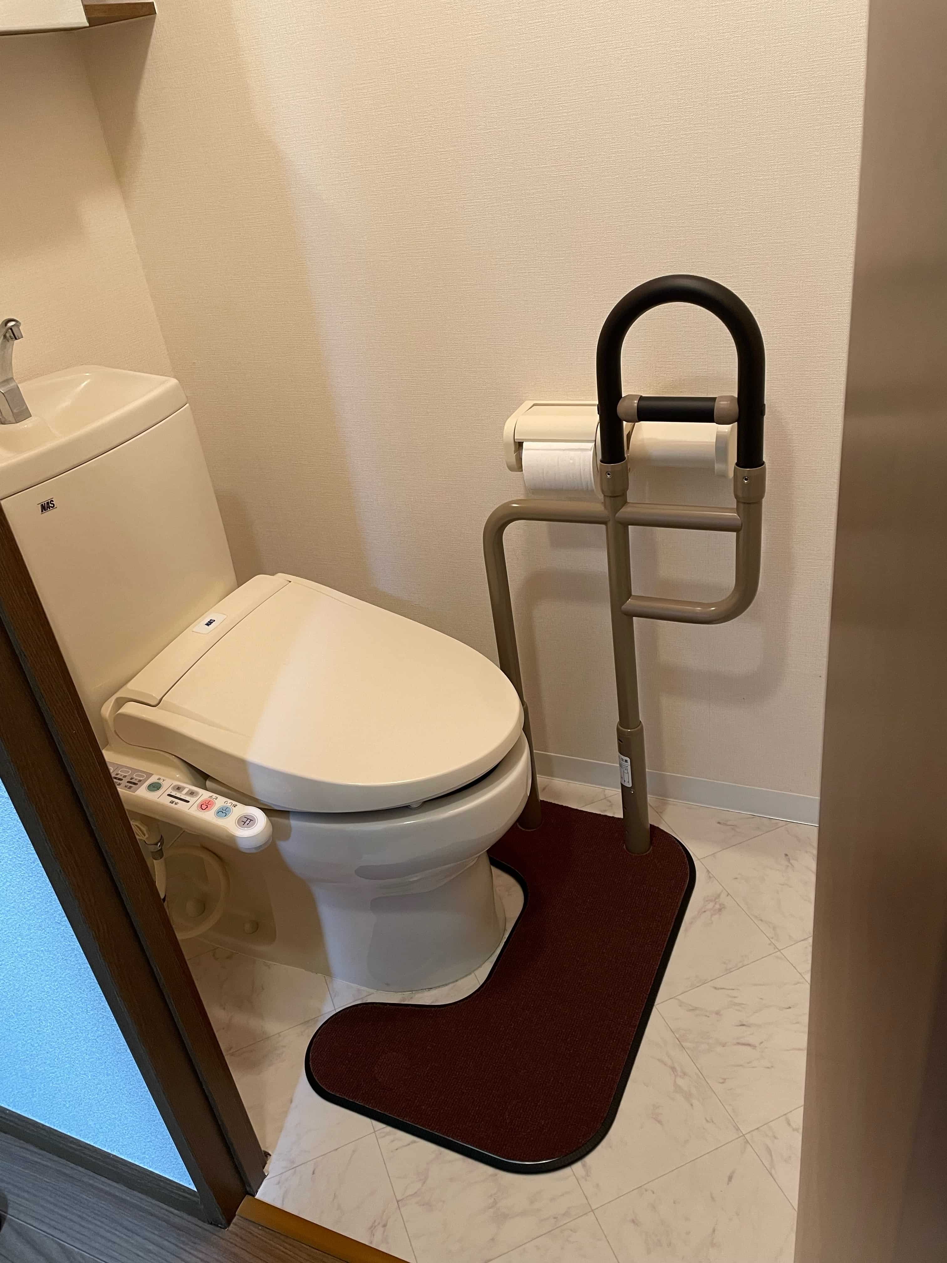 引っ張り込んでの立ち上がりが可能なトイレ用置き型手すりです。