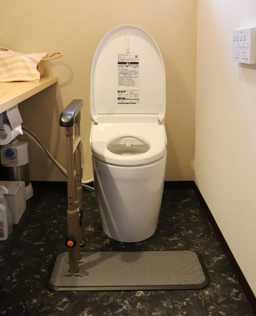 手すりは片袖で圧迫感がなく、ペーパーホルダーの干渉を避けられます。