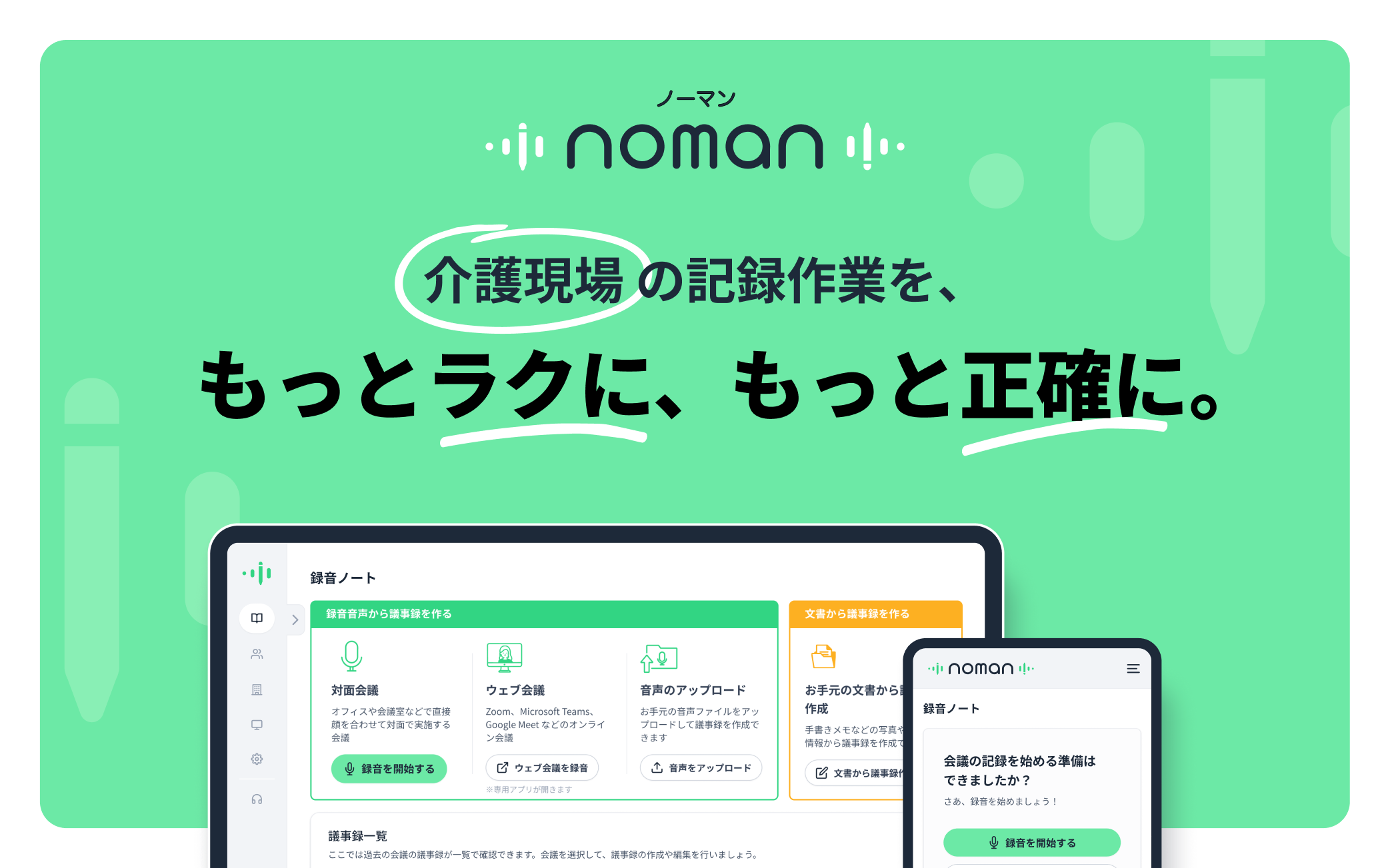 AIが自動で議事録作成! 介護業界に特化した「noman」で記録作業をもっとラクに、もっと正確に。