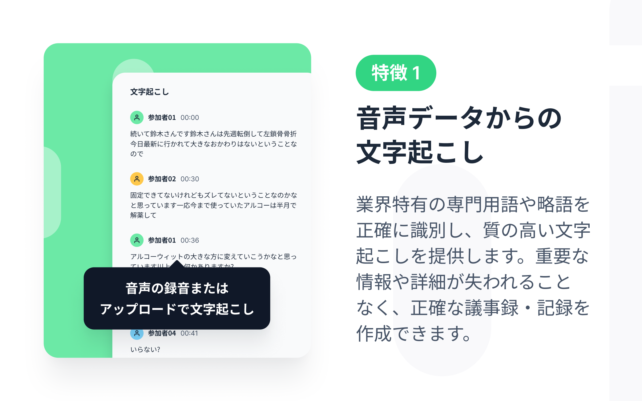 録音音声や簡単なメモを渡すだけで、AIが文字起こし・要約・整理までを自動で処理。正確で読みやすい議事録が、短時間で完成します。