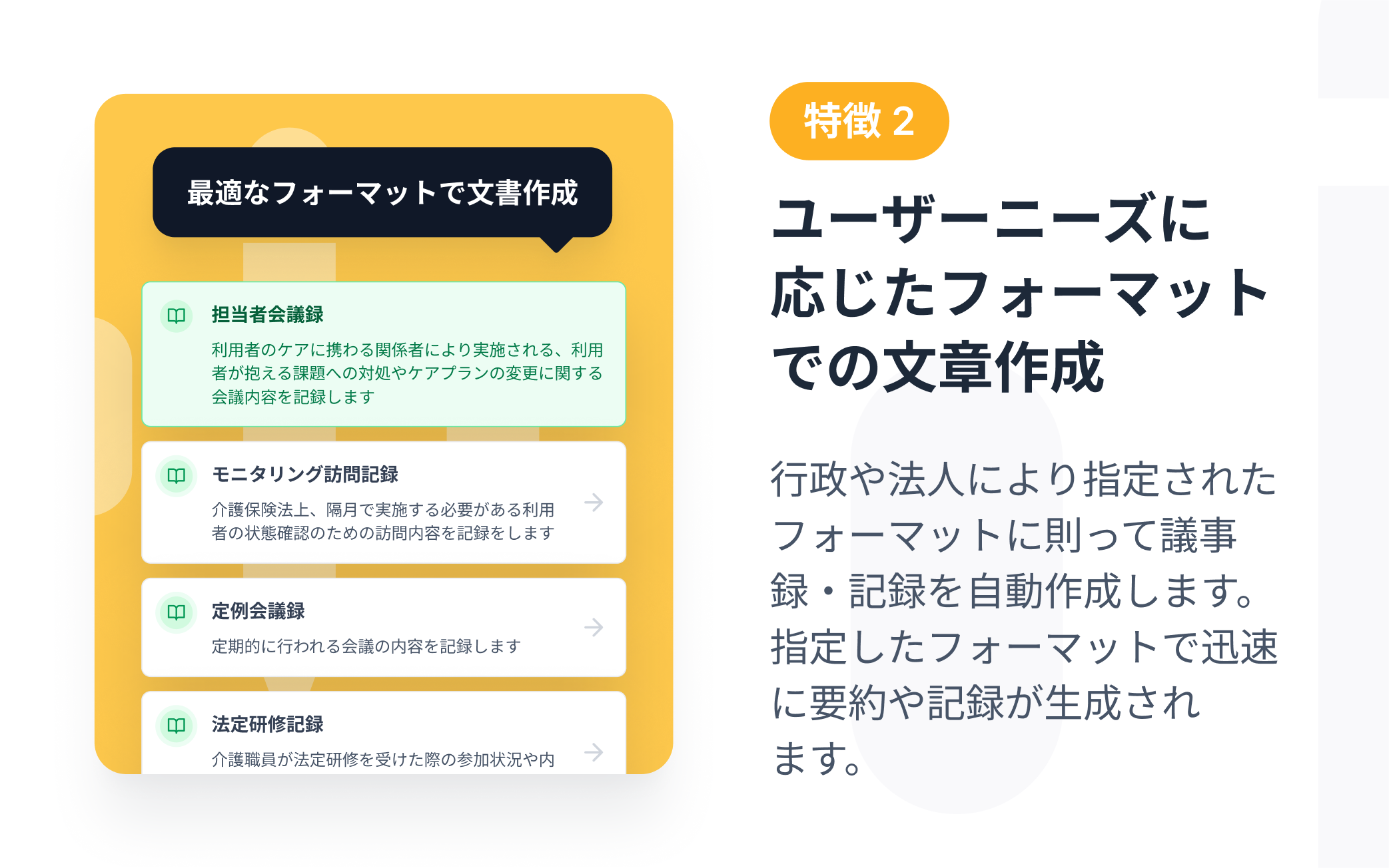 行政や法人により指定されたフォーマットに則って議事録・記録を自動で作成。必要な項目に沿って迅速に要約や記録が生成されます。