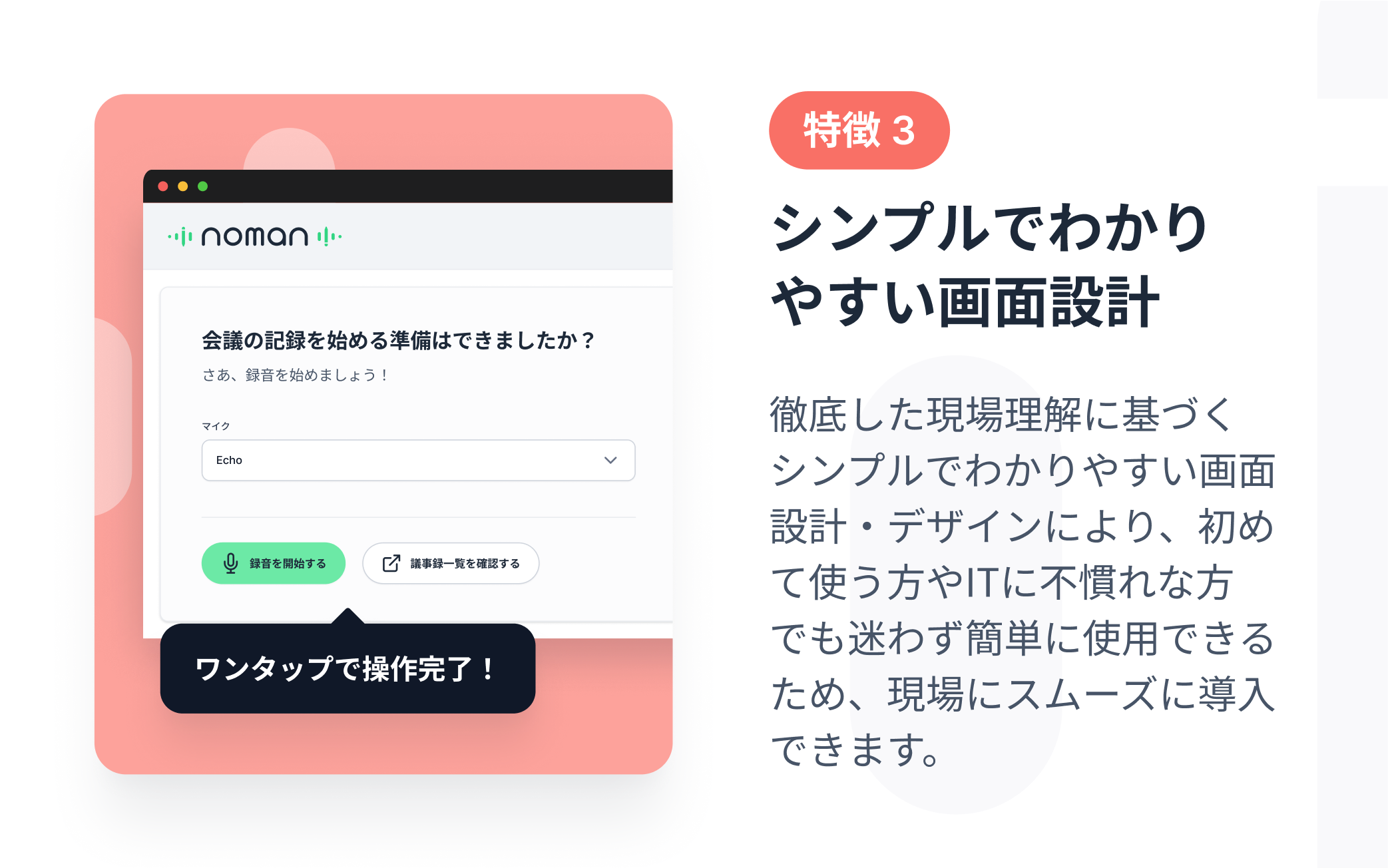noman(ノーマン)は、介護業界の現場の声から生まれた、業界特化型のAI議事録作成ツールです。