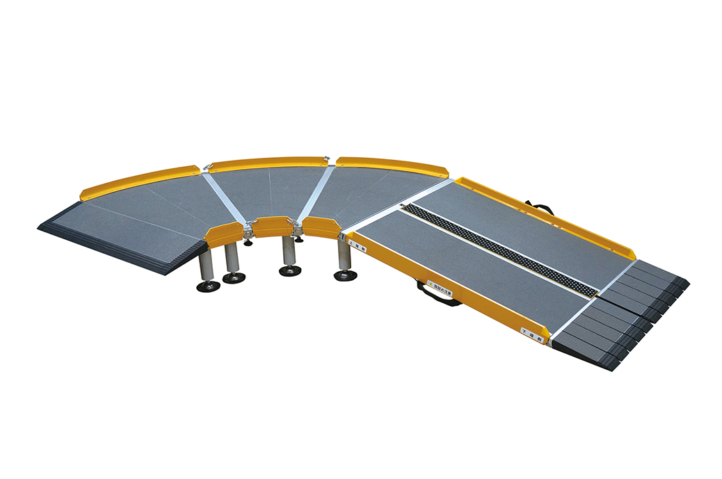 パーツを組み合わせて置くだけの簡単設置で、曲がる角度を30°・60°・90°より選択可能です。また、スロープ下端部が細かく分かれているため、道路勾配等の傾斜に沿って安全に設置できます。