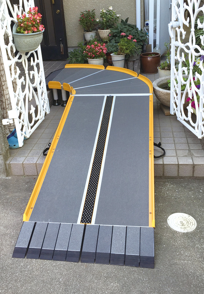 限られた場所にも設置でき、坂道にも安定して設置できる対応力抜群のスロープです。