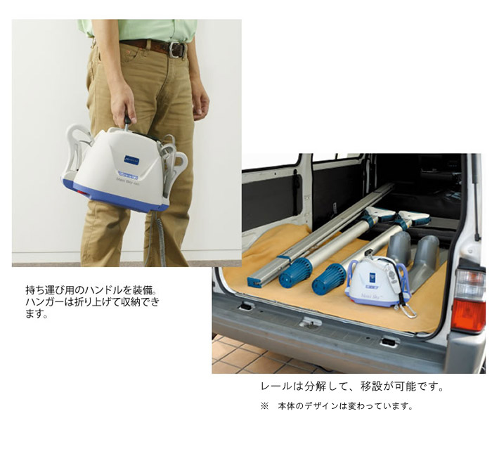 リフトによる移乗介助は一定の手順で進められ操作は難しくありません。リフト本体はレールに沿って軽い力で移動できます。レールはお部屋へ持ち込みやすく5分割された組立式で、レールの高さと幅はお部屋に合わせて調節可能です。宿泊施設にもレンタルされています。
