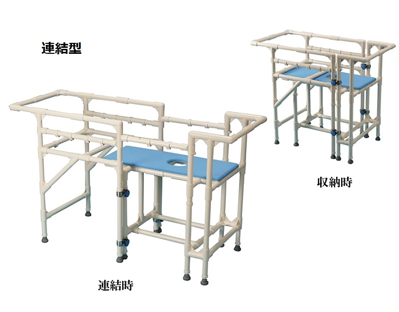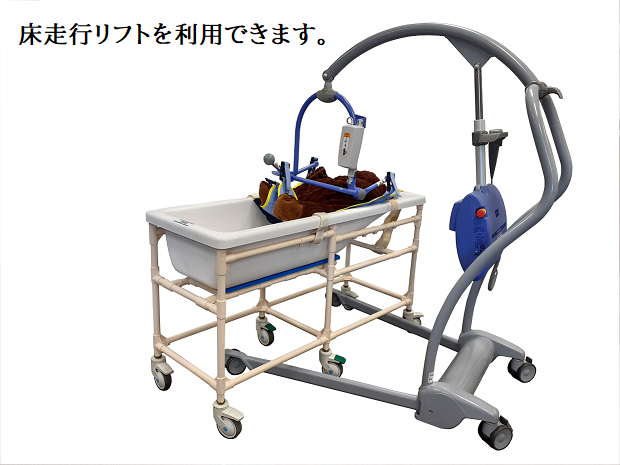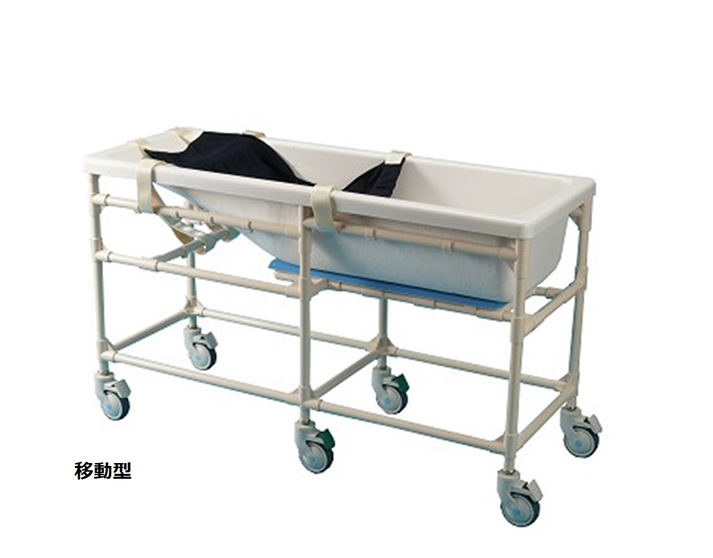 成長により、市販のベビーバスなどは成長とともに小さくなり、家庭のお風呂はまだ大きすぎる。入浴サービスを利用するのではなく、家で好きな時に安全に入浴させたい。そうしたご家族の要望を踏まえ、北九州市立総合療育センターと共同開発しました。ユニットバス1416サイズ以上で利用できるよう設計してあります。フレームを前後に2分割して浴室内に持ち込める連結型フレーム仕様。キャスター付きの移動型もあり、病院、施設でも利用されています。
