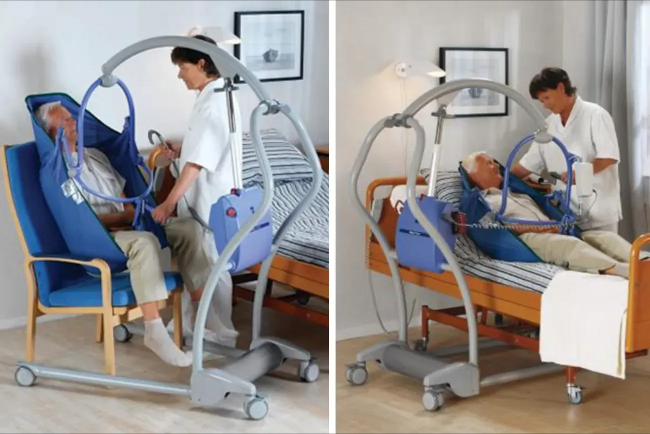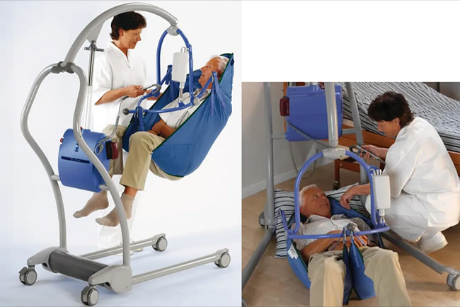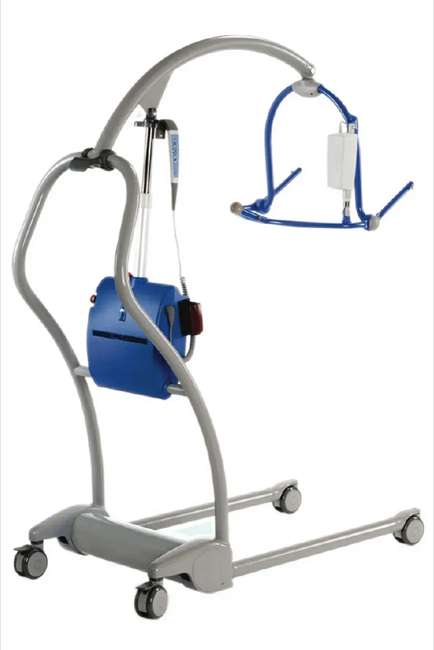 2本に分かれた支柱で荷重を分散し動かしやすい構造で、使い始めたら手離せなくなる介護リフトです。利用者の足が支柱に干渉しにくく安全。最大荷重182㎏とパワフルで、大柄な利用者も安心。電動DPSハンガーは手元スイッチで吊り姿勢を変えられます。臥位姿勢のまま移乗も可能。専用スリングシートストラップ部が短く、揺れにくいリフトです。
