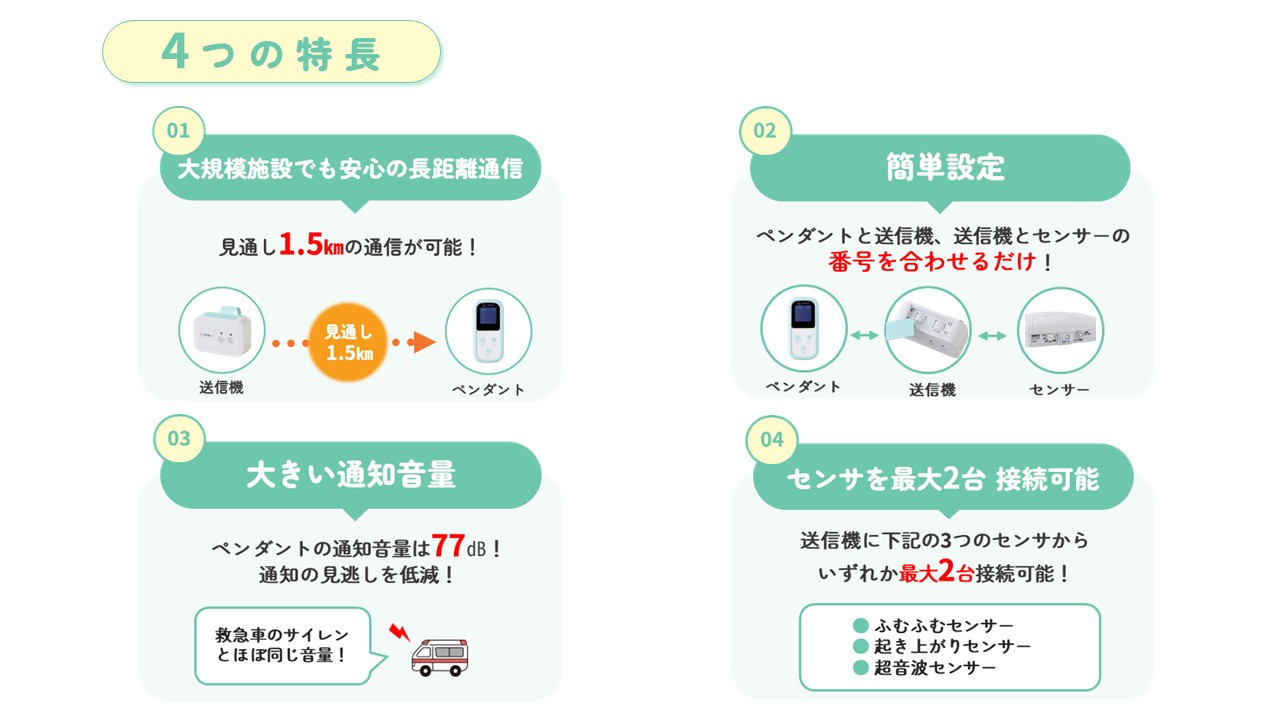 送信機からペンダントまで見通し1.5kmの長距離通信が可能!
