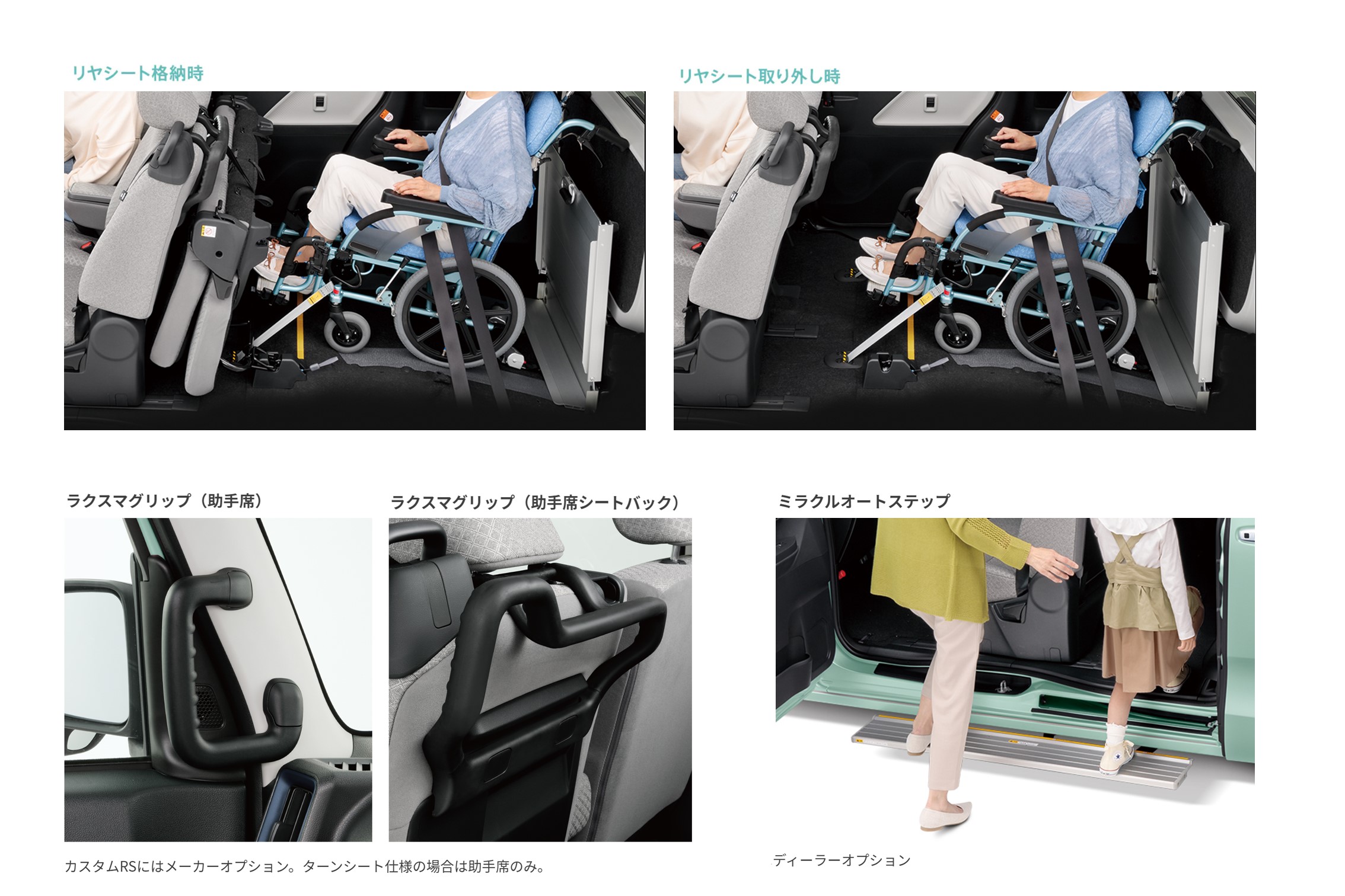 国内車いす移動車で最廉価のグレードから、助手席ターンシート付き仕様や、スタイリッシュでターボエンジンによる力強い走りの最上級カスタムグレードまで、更には、乗り降りのしやすさを追求したグリップやステップなど、タントならではの優しさあふれる豊富な商品ラインナップを用意しています。