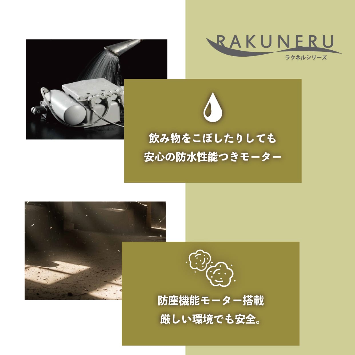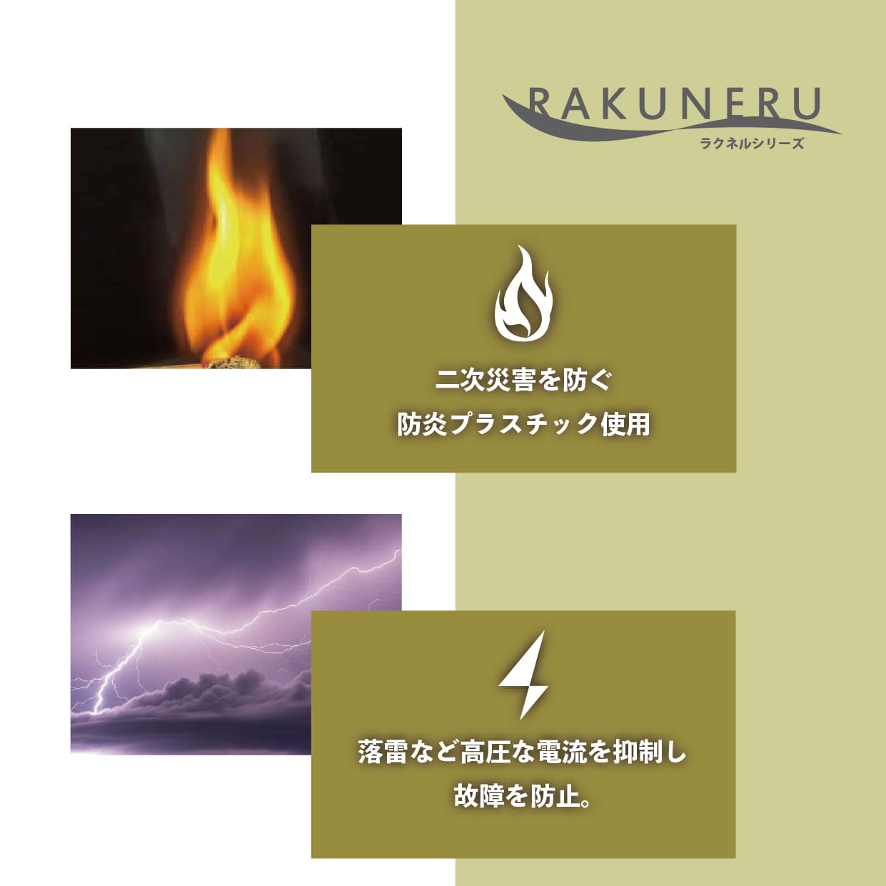 雷などで過電圧時の安全装置と可燃しにくい素材を使用。さらに防水・防塵仕様で非常時に心強い安全機能を搭載したモーターを仕様。