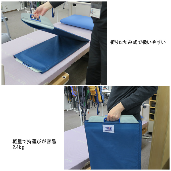 インナーボードの周りをアウターシートが回転する仕組みの移乗ボードです。軽い力で水平方向へ滑らせることができます。ベッドからストレッチャーなどへの移乗の際に隙間があると危険です。イージーロールが橋渡しとなりその隙間を埋めるので、安全に移乗介助が行えます。二つ折りができ、持ち運びと保管が容易です。