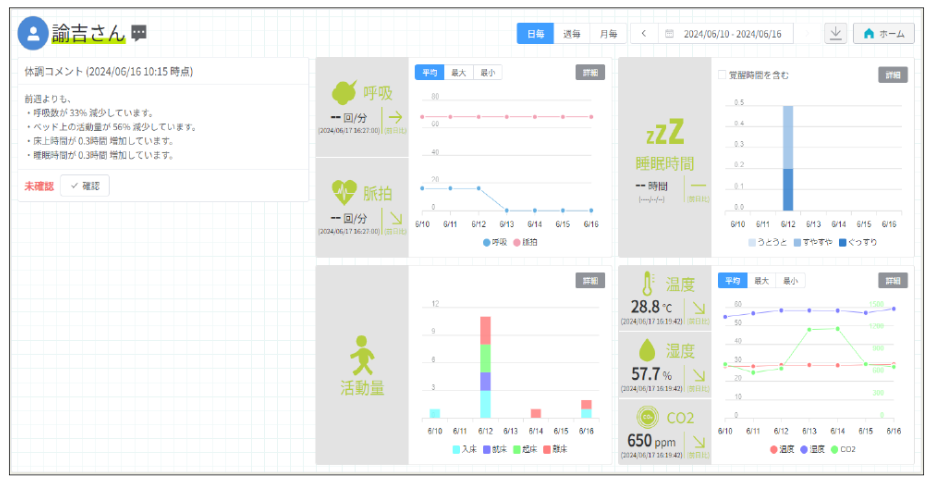 また、非接触型のバイタルレーダーセンサーと接続する事で、ベッド上の人のわずかな動きから呼吸数と脈拍数を計測し、異常があればアラートでお知らせすることも可能です。