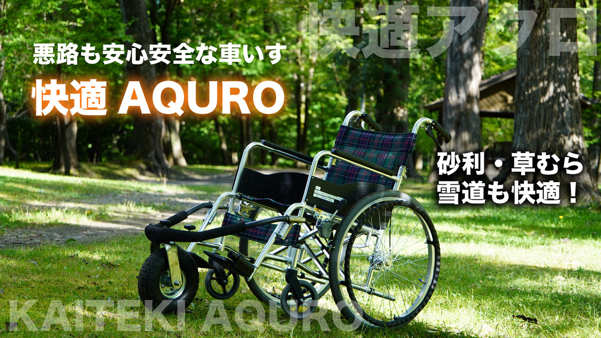 大きな前輪を組み込んでいる車いす快適AQUROは、車いすの前輪が雪や砂利、小さな段差へのつまづき、転倒の危険性が軽減され、