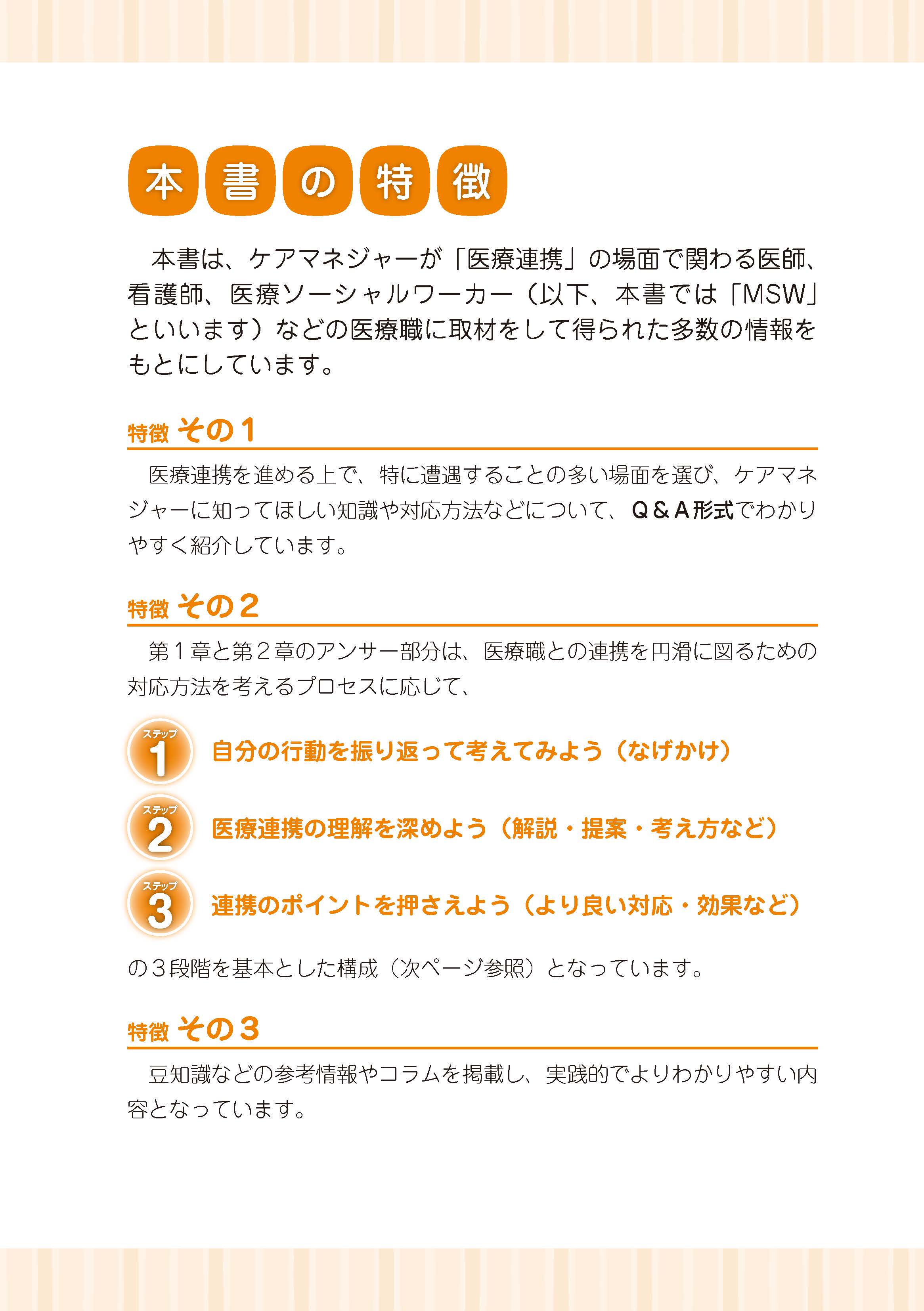 医師や看護師などの医療職に取材した現場の生の声をもとに、医療連携をスムーズに進めるためのポイントやアドバイスなどを「Q&A形式」でわかりやすく解説! ケアマネジャーの医療に対する苦手意識を自信に変え、医療から逃げない覚悟に貢献する必読の書です。