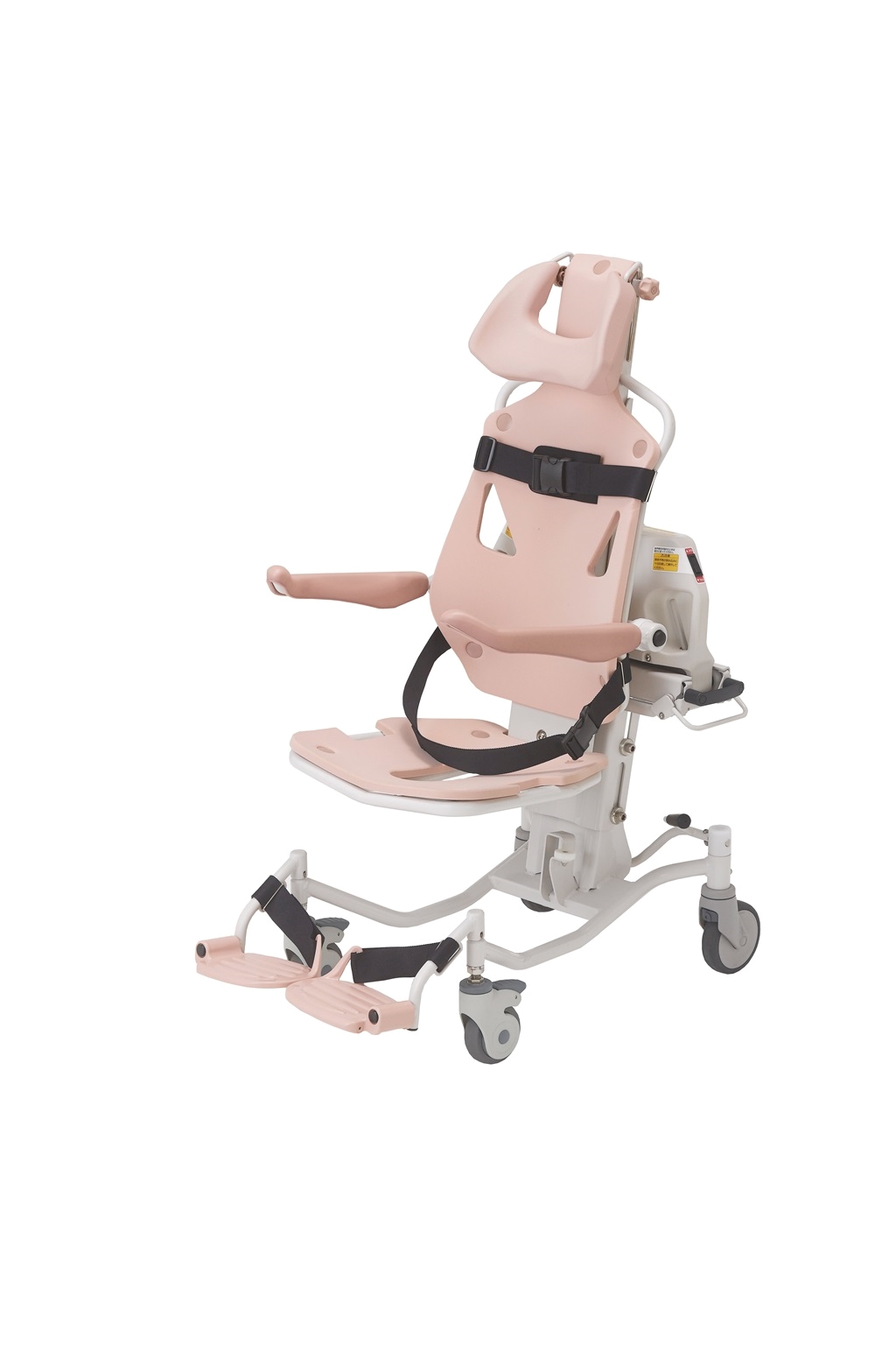シートは電動で昇降(バッテリー駆動)します。駆動部の左右にスイッチがあります。工事不要の専用レールを既存浴槽に設置するか、専用バスタブと合わせて導入することで、シートのスライドにより、ご利用者を吊り上げることなく、簡単に入浴していただけます。(※商品説明動画は、旧モデルのLS-300です)