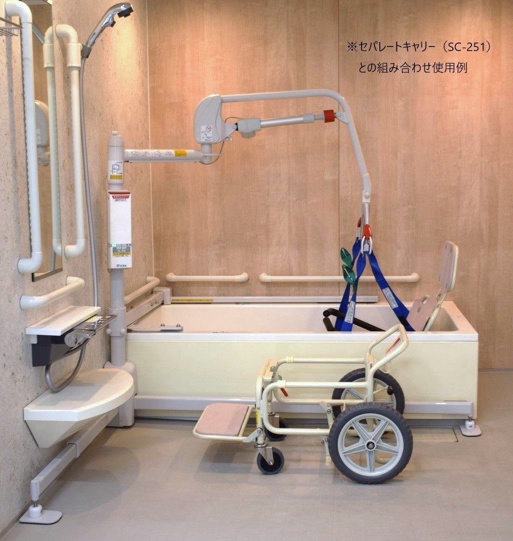 床に置くだけで簡単に設置できますから、工事費が不要で導入コストを抑えられます。バッテリー(リチウムイオン)駆動でユニットバスにも使用できます。入浴には、スリングシートやセパレートキャリー(SC-251)をご使用いただけます。リフトを使用しない場合は、アーム部分を折りたためるので一般浴の際に邪魔になりません。参考出品しておりますので、ぜひ弊社ブースへお越しください。